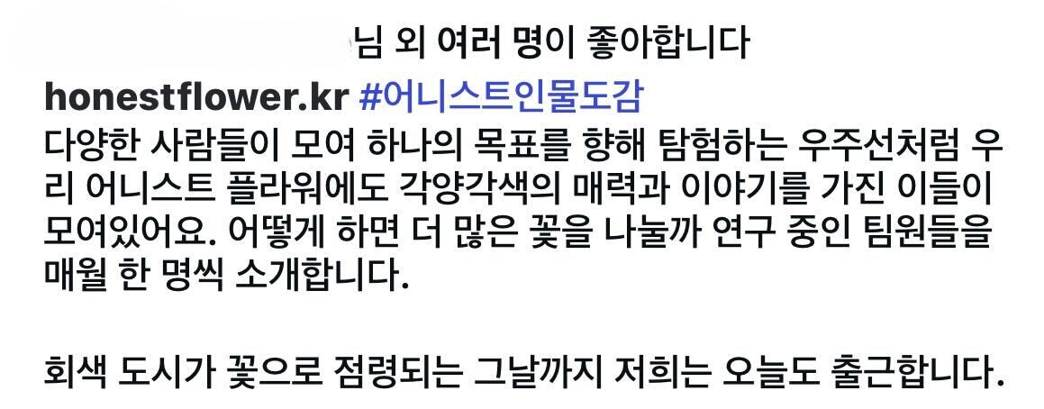 네. 우리는 '어니스트 플라워'를 다시 정의하는 중이에요. 정확히는, 우리가 누구인지, 왜 꽃을 전하고 싶은지, 어떤 방식으로 이야기할지, 처음부터 다시 깊이 있게 들여다보고 있어요. "꽃으로 삶을 이롭게 한다"라는 새로운 슬로건도 나왔죠. 어딘지 거창해 보이는 문장 앞에 갸우뚱했던 것도 잠시, 문득 떠올랐던 건, 몇 달 전 팀 인터뷰 콘텐츠를 SNS에 업로드하면서, 작성했던 카피 한 줄이에요.